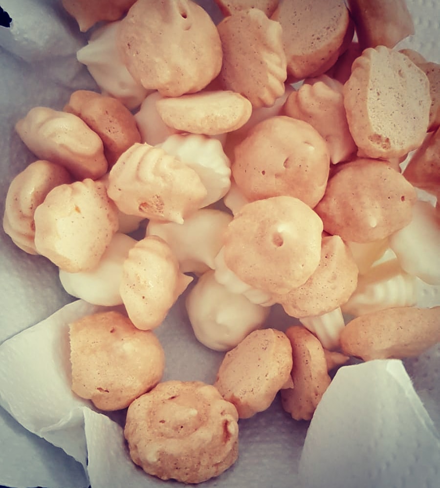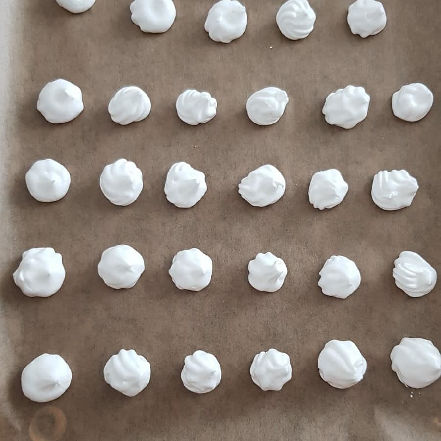 Put the batter in a pipping bag and make small meringues on the baking sheet.