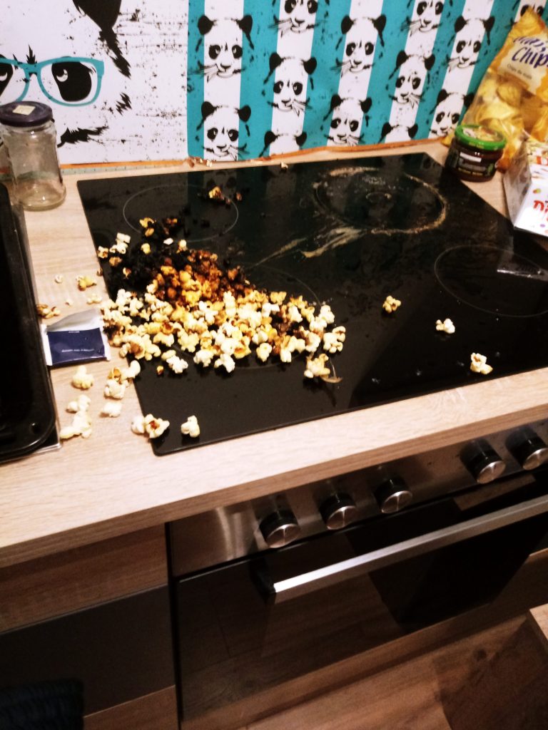 I had a popcorn plastic bowl on the stove. Because I was sleepy, I opened the wrong place on the stove and set the bowl on fire. Panic! Smoke was starting to come out so I screamed really nice to my husband to come, urgently.