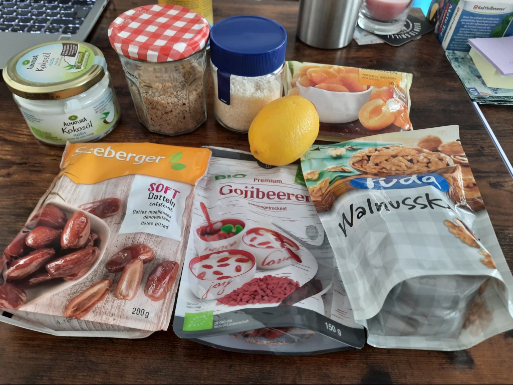 Ingredients : 200g Dates, lemon zest, 50g dried apricots, 5og ground goji berries, 20g Coconut Oil, 150g ground nuts, 50ml Rice milk. For decorating I used coconut flakes and ground nuts.