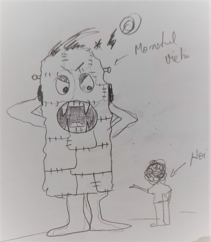 I will attach here a drawing with me and the Monster of Life. He is a creature that is made from all our thoughts, the dark ones, the ones that we can not make go away. I am happy that a friend helped me discover this monster. We were speaking about how when you go to therapy, you talk about your feelings but they are still there, you go home and stay with them all your life.